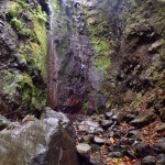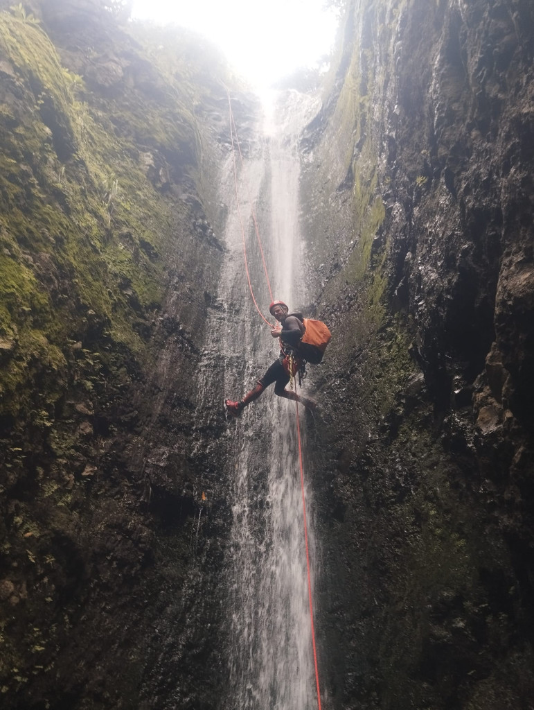 The access from Funda is a little difficult to find, then it is overgrown with thorns in places, we removed some with a machete, but the brambles grow quickly. From the forest, the path is clear. The first 100 metres in the ravine were an hour-long battle against the brumbles, but we won and cleared the path with two machetes. The first abseil is on the large boulder on the left. At the second cascade, the first two anchors are well back and two more are just beyond the right bank ridge on a large boulder. The rest is easy to find, with the exception of the last piton. The entry to Funda was very spectacular.